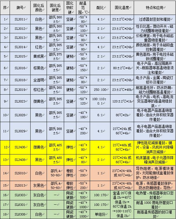 灌封膠的詳細性能參考表