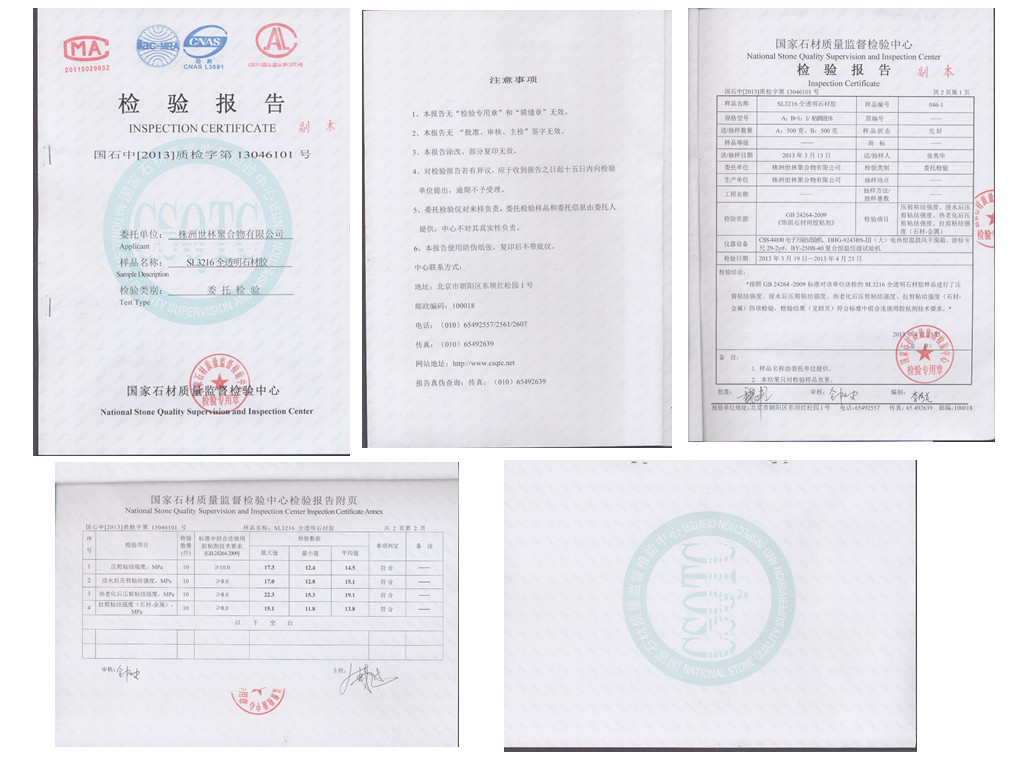 世林膠業(yè)SL3216透明石材膠送國(guó)家石材質(zhì)量監(jiān)督檢驗(yàn)中心檢驗(yàn)合格
