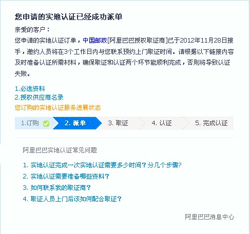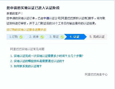 阿里巴巴實(shí)地認(rèn)證服務(wù)分為取證與認(rèn)證兩個(gè)環(huán)節(jié),取證服務(wù)有特定的取證商:中國(guó)郵政和中誠(chéng)信;認(rèn)證服務(wù)有特定的認(rèn)證商:中誠(chéng)信,杭州中德,北京匯華。如果你那的材料齊全,在上門取證后的16個(gè)工作日內(nèi)會(huì)有認(rèn)證結(jié)果(認(rèn)證成功或認(rèn)證失。,并且到時(shí)會(huì)有旺旺浮出提醒。